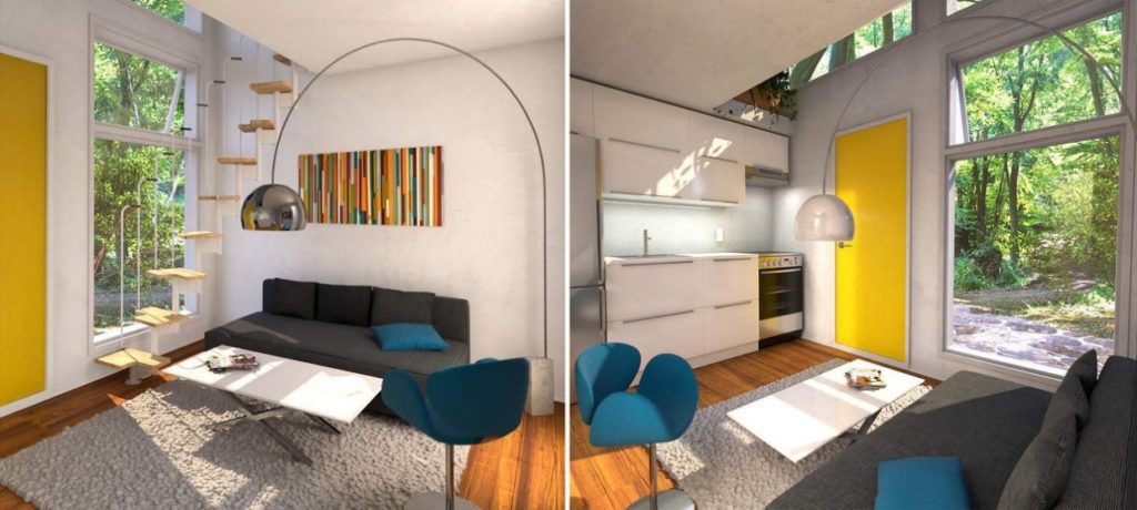 Cost-effective housing, despite its size, can boast a visual sense of space and comfort. The interior space consists of a living room combined with a kitchen, amenities and a bedroom located on the second level, where a non-trivial staircase leads. Built-in storage systems freed up space, and spacious windows, laconic furniture, and a neutral color palette increased it at the level of sensations. Engineers from Vancouver dream their creation being sold at an affordable price that is less than €27,300. Now, it can be ordered on Amazon for €35,300.